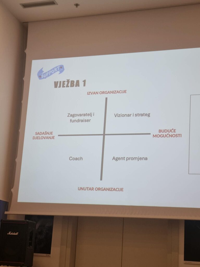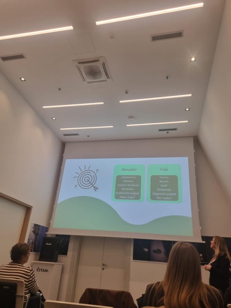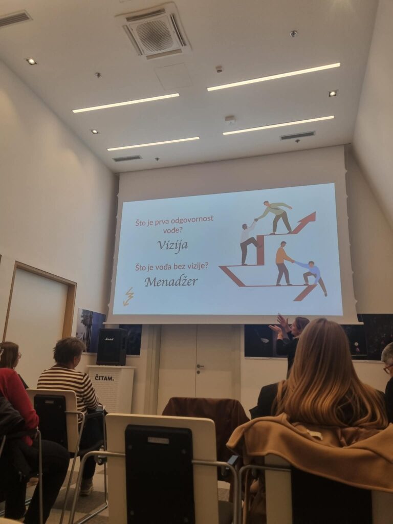 Istaknute su i četiri ključne uloge vođe: vizionar/strateg, agent promjene, coach i javna uloga. Kroz dvije kratke vježbe sudionici su imali priliku prepoznati vlastite snage i područja za razvoj unutar tih uloga.