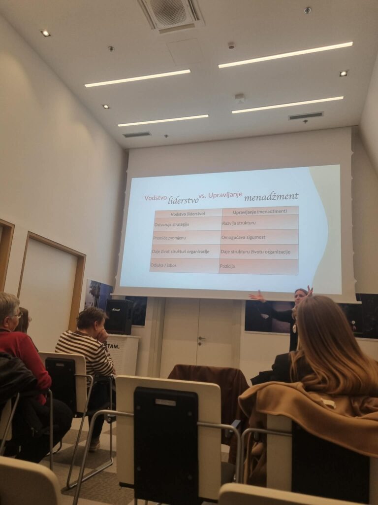 Edukaciju je vodila gospođa Mladenka Majerić, koja se na samom početku predstavila sudionicima te najavila ključne teme susreta. U uvodnom dijelu potaknula nas je na promišljanje kroz pitanja: Što za mene znači vodstvo? Kako prepoznajem dobrog, a kako lošeg vođu? Što znači raditi sa svrhom i koju promjenu želimo vidjeti u društvu? Ova su pitanja otvorila prostor za osobnu refleksiju i razmjenu iskustava.