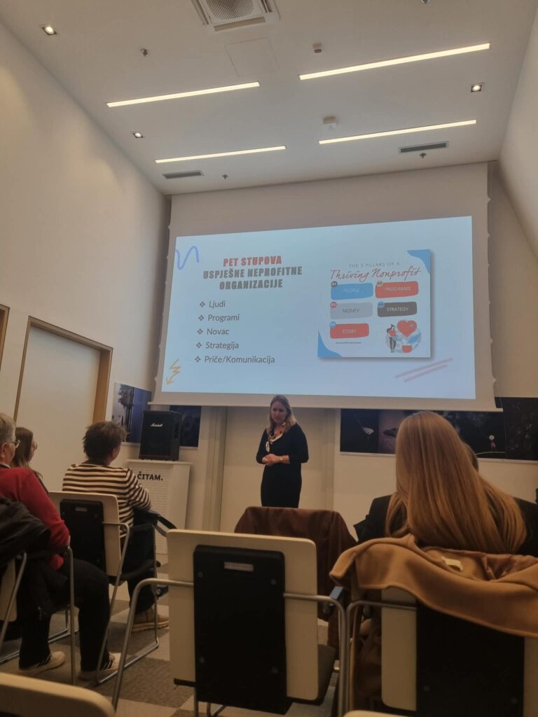 Središnji dio edukacije bio je posvećen pet stupova uspješne neprofitne organizacije: ljudima, programima, novcu, strategiji i priči. Kroz raspravu smo promišljali jesmo li u svom radu više vizionari ili menadžeri te gdje se u toj podjeli najviše prepoznajemo – u životu i u organizaciji u kojoj djelujemo. Posebna pažnja posvećena je razlikama između lidera i menadžera.